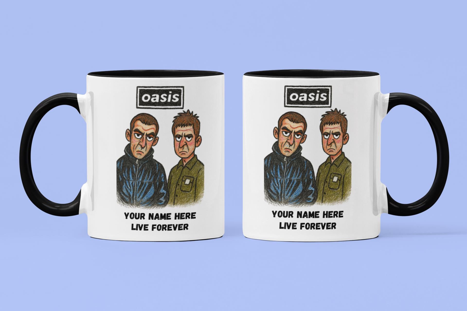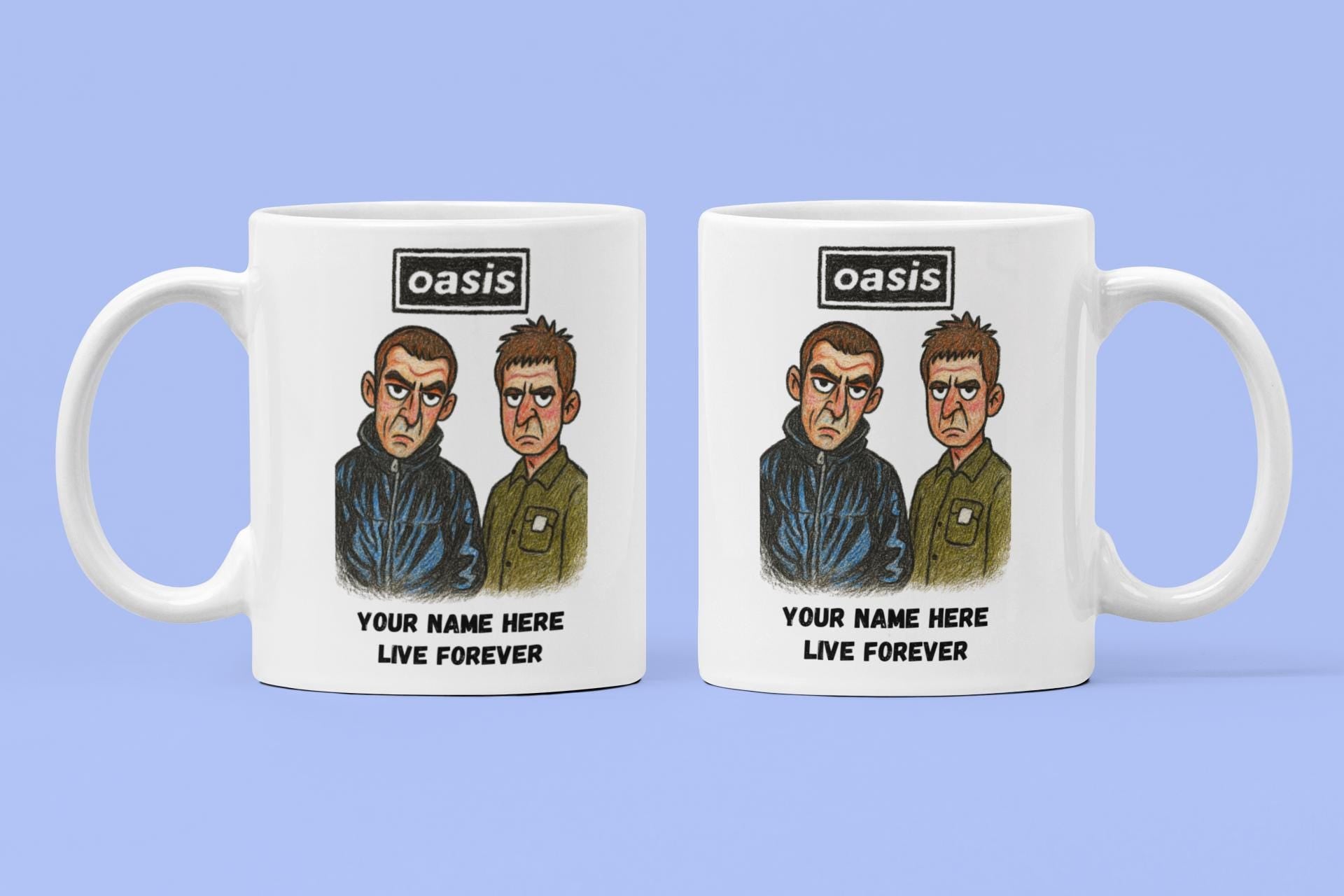 ✅ Oasis Fan Mug – Cartoon-style duo with a cheeky nod to “Live Forever,” perfect for Britpop lovers.